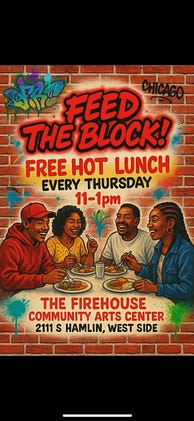 **Every Thursday, join us at the Firehouse Community Arts Center for a *free hot lunch*—an essential support boost as we navigate the recent loss of SNAP benefits in our communities. Every Thursday, we're coming together to support each other with community, nourishment, and care. #CommunitySupport #FoodJustice #Chicago #SNAP #westside