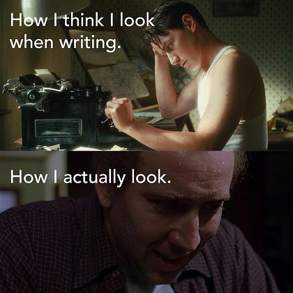 How I Think I Look Writing Substack vs How I Actually Look Writing.