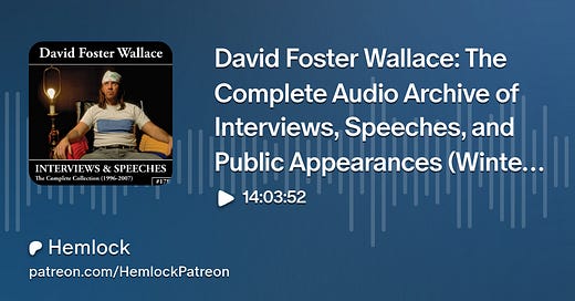 For the Winter Solstice I have made a 13 hour compilation of every interview David Foster Wallace ever gave. It stretches from 1996-2007 in chronological order. Each episode is individually remastered. It’s free and there are no ads. Complete interview listing in the Substack article. Happy Holidays.