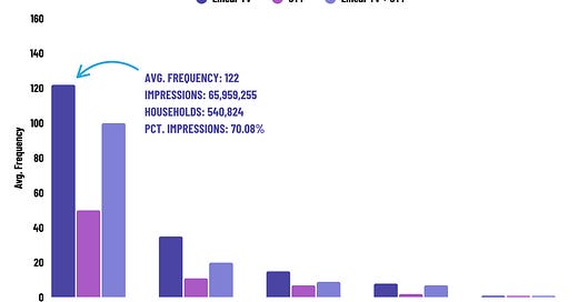 To illustrate TV’s saturation challenge, we can look at the 2025 New Jersey gubernatorial primary. Earlier this year, over $100 million was spent in the Democratic primary. And just 20% of TV viewers received about 70% of linear TV ad impressions. That’s a lot of impressions to very few people:
