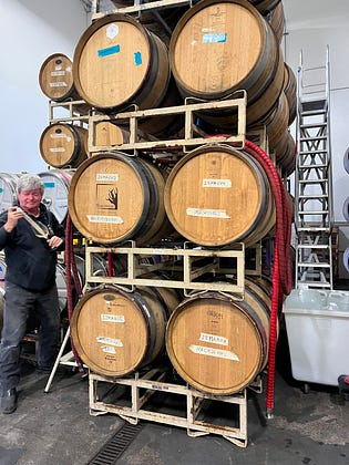 Greg La Follette from Marchelle stands next to his six separate Chardonnay barrels. Seguin Moreau, Tonnellerie O, and Orion are some of the few shown. Each was selected for nuance future the Tritone Chardonnay blend.