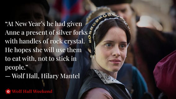 “At New Year’s he had given Anne a present of silver forks with handles of rock crystal. He hopes she will use them to eat with, not to stick in people.”— Wolf Hall, Hilary Mantel