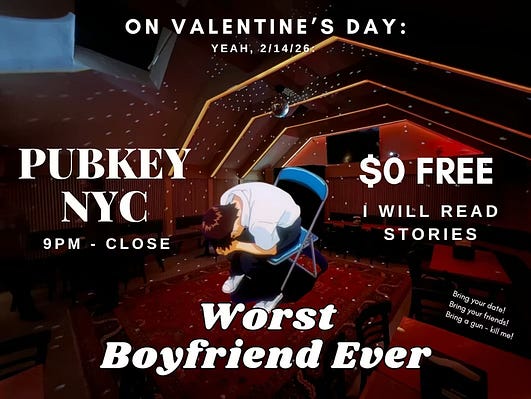 On February 14th 2026 at 9 o clock PM I will read some stories aloud at PubKey Bar in lower Manhattan. Some old stuff and some new stuff I haven’t shared yet. The address is 85 Washington Pl, New York, NY 10011 I will be selecting other people to go up and read too. The story/piece must be lov…