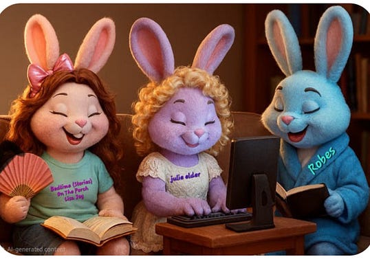 Join us nightly at 9:30 ET for Bedtime (not) on the Porch (sorry folks, it is getting chilly at night), the Substack show about everything and nothing, with a weekly writing prompt, stories and friendship! Your cocohosts: Lisa Joy, Julie, and Robes!