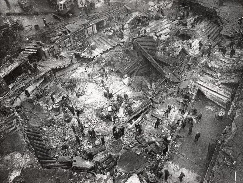 I had just got into the Bank station and down on the Central Line platform before the bomb fell into the booking hall. What happened there I only know of second-hand. We were amongst those caught on the Central Line platform. The explosion was pretty fierce, the lights went out and the air was so thick with dust that torches were of little use. Most of those sleeping at the bottom of the escalator seemed to have been killed outright as well as one or two on the platform.