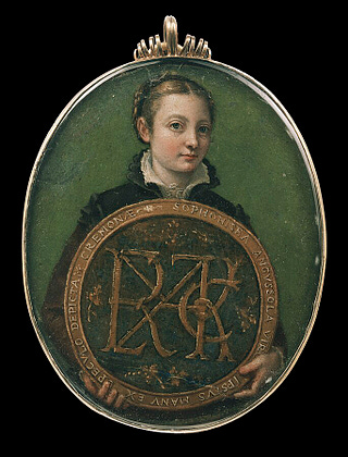 This miniature, now housed at the Museum of Fine Arts in Boston, dates to around 1556 and depicts a self-portrait of Sofonisba holding a roundel with a complex monogram containing the letters that make up her father Amilcare's name: ACEILMR. The miniature was likely intended as a gift for him.