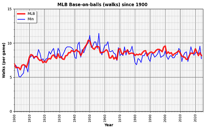 3/3. The baseball regular season is over, so here’s a look back at the rate of base-on-balls (walks) starting in 1900. The red line is the combined MLB teams, the blue line is my Minnesota Twins (formerly the Senators).