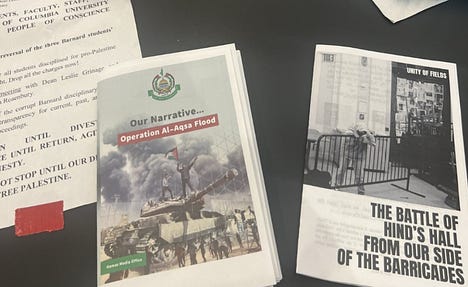 First, the shameless gaslighting about how the pro-Hamas wing of the protests is relegated to a miniscule inconsequential fringe. Meanwhile, protestors distribute literal terrorist propaganda verbatim. If your movement is unhappy with the terrorism association, fix your own house instead of getting mad at others for noticing facts.