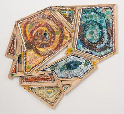 Bespoke stretcher bar frames in puzzle-like compositions appear to unfold, origami-like, in the mixed-media work of Chicago-based artist Mike Cloud. “Paintings are always objects within a system of objects,” he says in a statement. “My paintings are firmly anchored in the contemporary life of reproduction, symbolism, and description.”