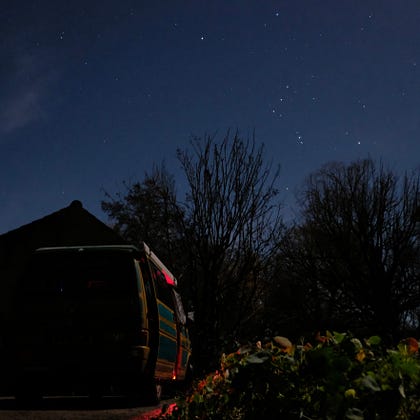 Looking roughly south late on a November evening, cloud permitting, you may not see my old VW T4, but you will see Orion surveying the galaxy. Patrik L