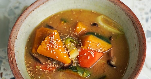 A Japanese-style stew made with kabocha pumpkin, miso and shiitake mushrooms. It’s the sort of thing that looks unassuming when you first put it on the table, but the first spoonful seems to fill every corner of the evening.