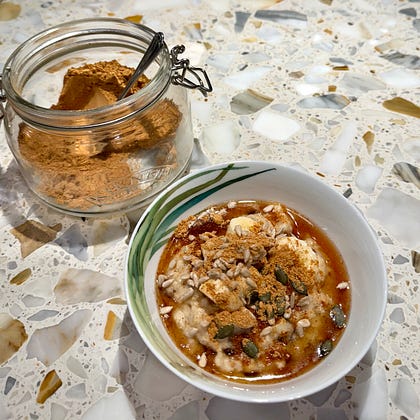 This morning’s porridge topped with kinako. I make a Kilner jar full once a month or so. Full of nutty aroma, it’s made from roasted soya beans that are then blitzed into a powder.
