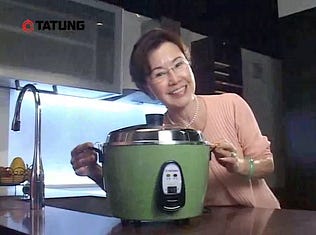 We got some really fun archival footage from an old instructional DVD for the Tatung Electric Steamers and Rice Cookers. Favorite quote: “Without a cook it’s ok, but without a Tatung, it’s not a kitchen.”