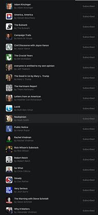 Pattern recognition: Anytime you see a nonsensical commenter on Substack, chances are their reading list looks something like this. I can’t understand why people pay for MSM regurgitations about the current thing when they can watch it for free on CNN/MSNBC or read it in NYT/NPR/WaPo.