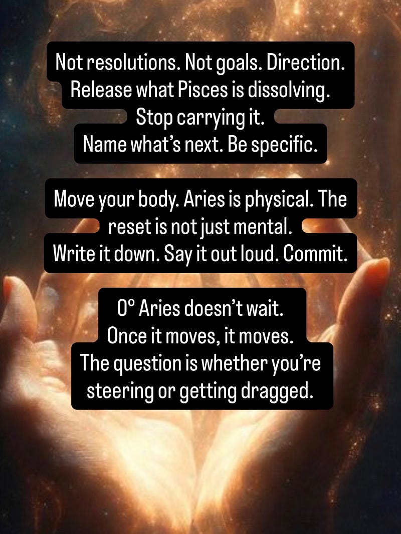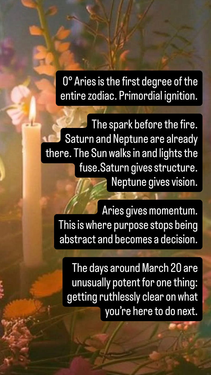 0° Aries is the first degree of the entire zodiac. Pure ignition. This is where vague intention becomes concrete direction.