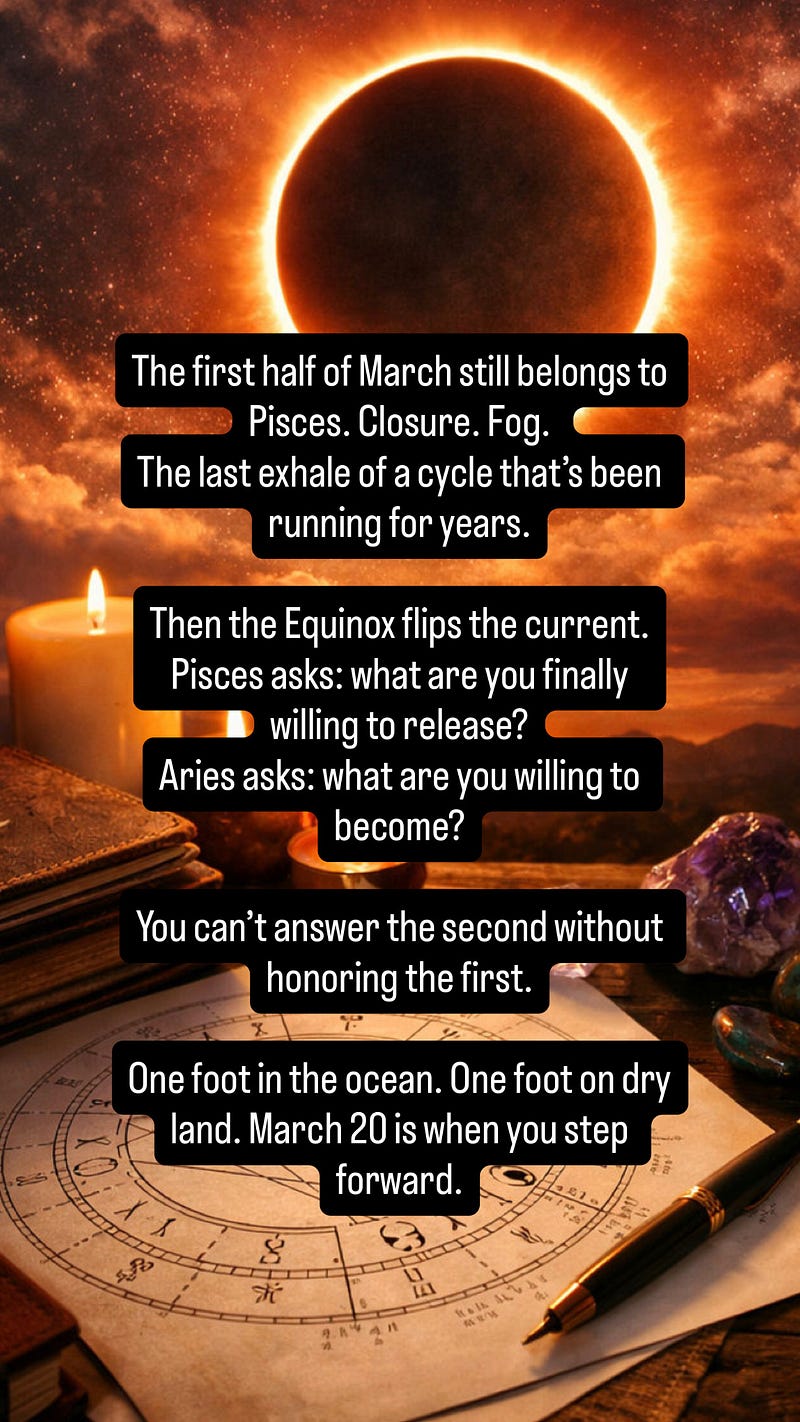 The first half of March still processes Pisces. Closure. Release. The final stretch of an old cycle.