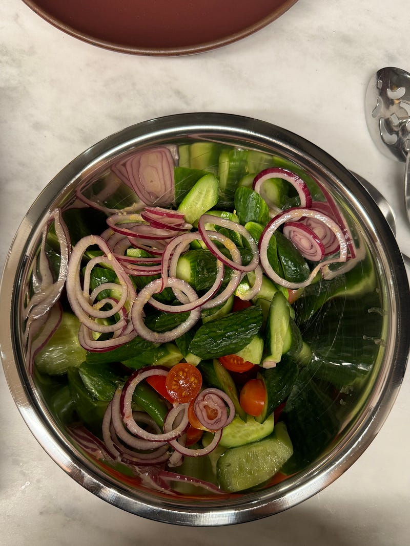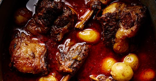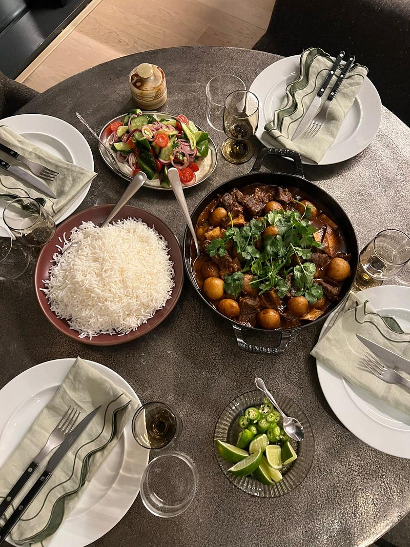 This dish is my fail safe any time I have a small group of friends over. Last year, I served it alongside the lemony cucumber salad (pg. 60) from TCC, and did chocolate mousse, karak chai (pg. 256), and some fruit for dessert. I think I’ll make it again for NYE.