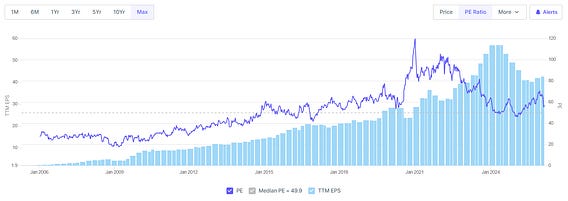 This chart captures the two feedback loops at work very clearly. Over nearly two decades, Asian Paints’ EPS has followed a positive feedback loop, compounding steadily through cycles. But the PE ratio has behaved very differently, swinging in a negative feedback loop, compressing to 20x during the 2009 global financial crisis and expanding to nearly 120x during the post-Covid quality and consumption mania of 2021, before moving back toward balance again.