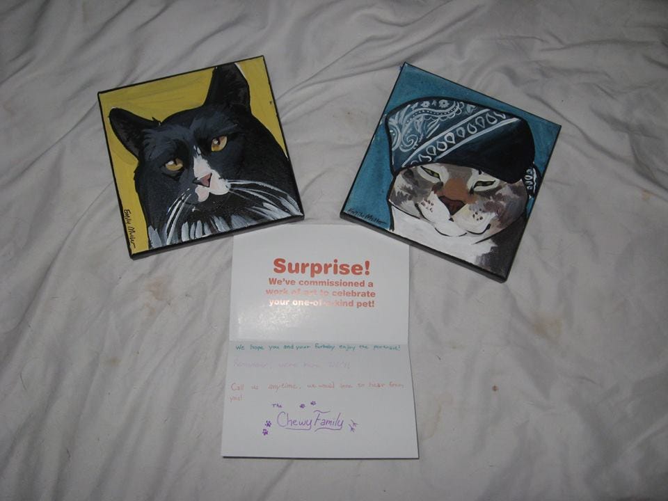 I was an early customer of Chewy and they sent me a gift of hand painted portraits of Elvis and Bear. I treasure these portraits.