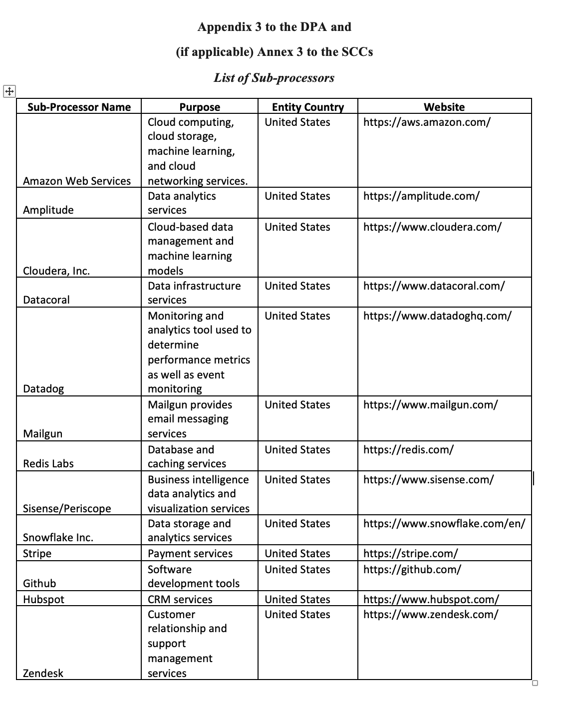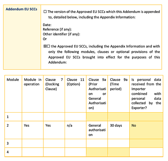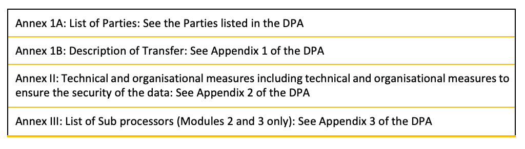 “Appendix Information” means the information which must be provided for the selected modules as set out in the Appendix of the Approved EU SCCs (other than the Parties), and which for this Addendum is set out in: