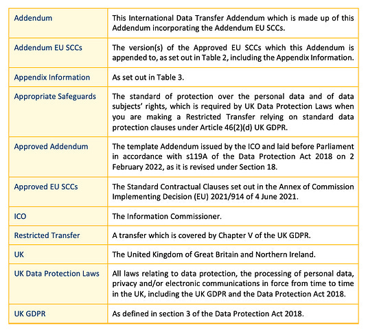 3. Where this Addendum uses terms that are defined in the Approved EU SCCs those terms shall have the same meaning as in the Approved EU SCCs. In addition, the following terms have the following meanings: