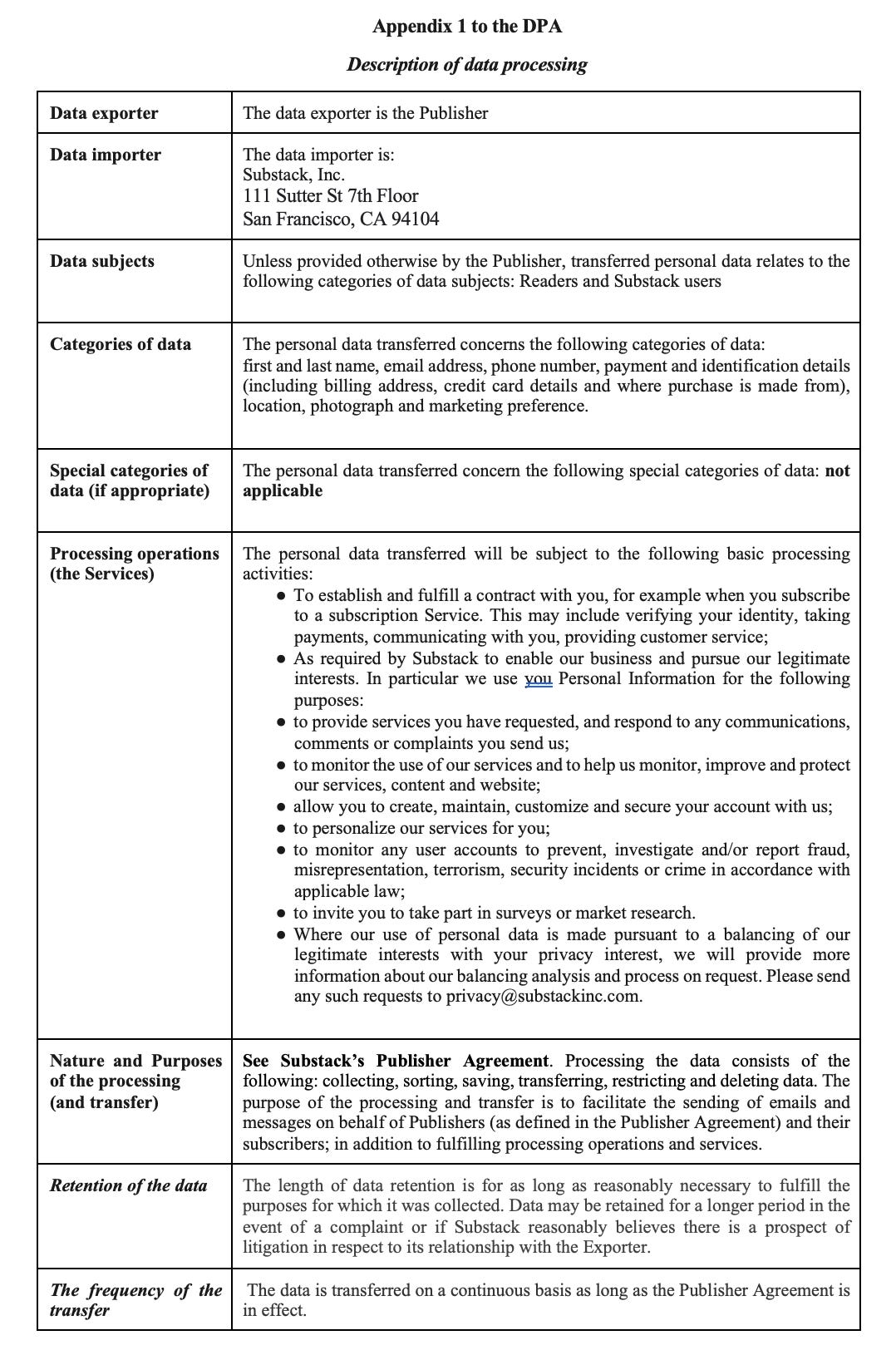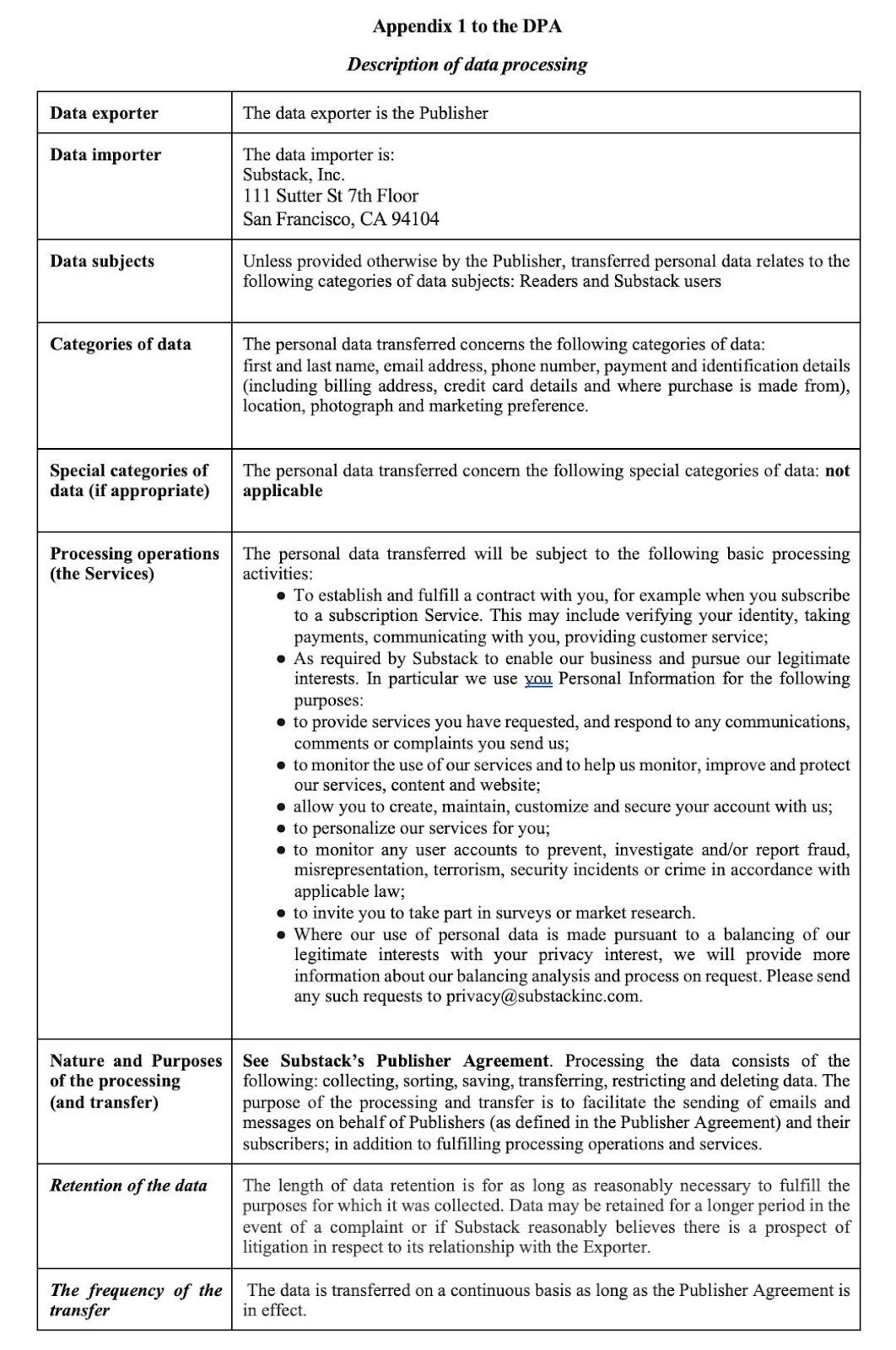 acknowledges that Substack, Substack affiliates and their respective third party service providers may process personal data in connection with the provision of Substack products and services to the Creator (the “Services”). A description of the processing activities performed in connection with the Services in provided in Appendix 1 to this DPA;