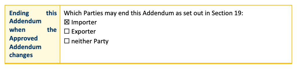 16. If the ICO issues a revised Approved Addendum under Section 18, if any Party selected in Table 4 “Ending the Addendum when the Approved Addendum changes”, will as a direct result of the changes in the Approved Addendum have a substantial, disproportionate and demonstrable increase in: