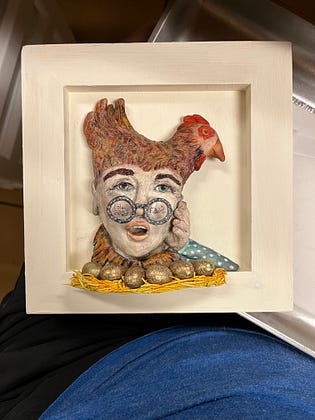 She’s almost finish. I still have decisions to make. Do I want her to be freestanding or do I want her in that shadow frame? I was trying to make her glasses look like she was looking at a grocery shop shelf. Does the backward reading sale price work?. I’m not sure that’s working so well so I have to rethink that. Unless I could paint it to look like it was a reflection and I’m not sure I can do that successfully. Back to my work table, results when I’m finished.