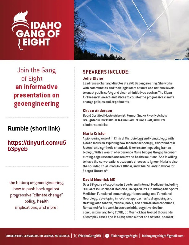 Idaho Geoengineering Event — Gang of Eight’s presentation on geoengineering. Learn why geoengineering and atmospheric intervention topics deserve serious scrutiny. Reposted with updates 01/25/26 (articles + Rumble video 1/14/26, 01:52:24)