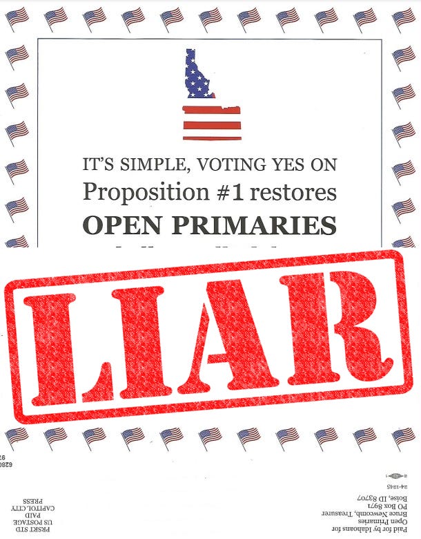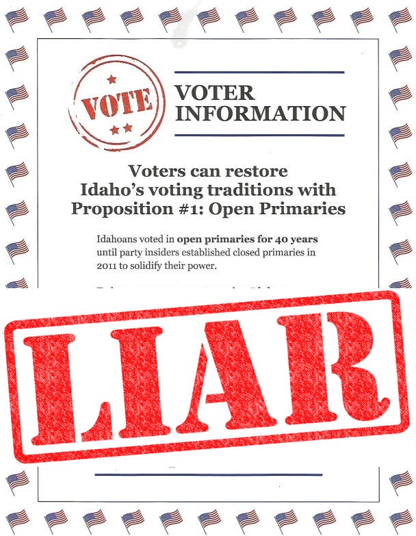 🤥 PROP1 LIE: Blanket or jungle top-four primaries (misleadingly called Open primaries) are necessary to open Idaho elections to all voters.