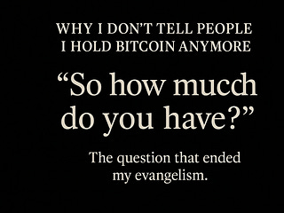 Just as you said you did…i have also gone quiet now in order to protect my peace. Ive learned I cannot borrow others my conviction. 99% of my interactions were a waste of energy, sadly. Nobody is willing to do the work because they aren’t interested, don’t question systems, or are too caught up in the rat race of life worrying about when their next check is coming, politics they have no control over, social media algorithms, traumas, or the system “working” for them. But I became the bitcoin guy not only in my work life but also in my home life and relationships were strained.